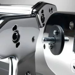 Marcatos classic pasta machine with motor. The machine has adjustable lasagna plate thickness, from 0.6 to 4.8 mm. Fettuccine (6 mm) and Tagliolini (1.5 mm) rollers included. Max lasagna plate width: 15 cm. Table bracket included.