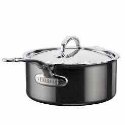 This saucepan from Meyer belongs to the Hestan series, which contains products with outstanding durability and cooking performance. The saucepan is made of stainless steel with thousands of titanium-based NanoBond coatings, which contributes to characteristics such as no stains and scratches, non-stick and that it is dishwasher safe.